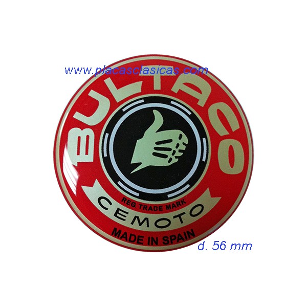 Placa Anagrama Bultaco en aluminio anodizado, mide 60 mm de diametro, bombeada para adaptarse mejor a la forma del deposito.