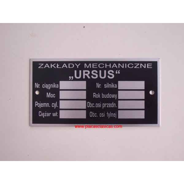 Placa caracteristicas Tractores URSUS, aluminio anodizado fondo negro texto color aluminio, medidas 98 X 51 x 1 mm
